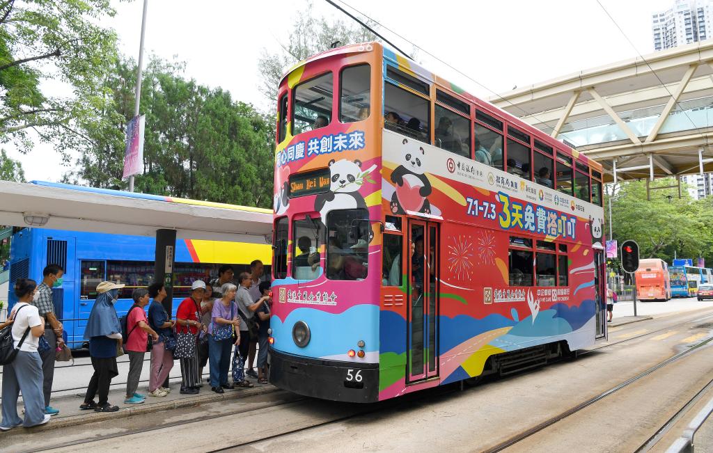 7月1日,一辆涂装“3天免费搭叮叮”宣传海报的电车从香港街头驶过。新华社记者 陈铎 摄
