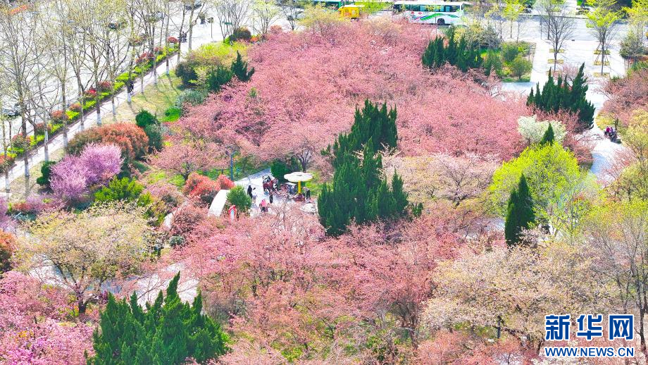 樱花园中,葱郁绿树与缤纷花瓣相互交织,共同晕染出春天独有的斑斓色彩(无人机照片)。新华网发(丁敏航 摄)