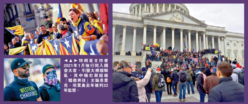 图:特朗普支持者2021年1月强行闯入国会大厦,引发大规模骚乱,其中极右翼组织“骄傲男孩”主脑恩里克.塔里奥去年被判22年监禁。