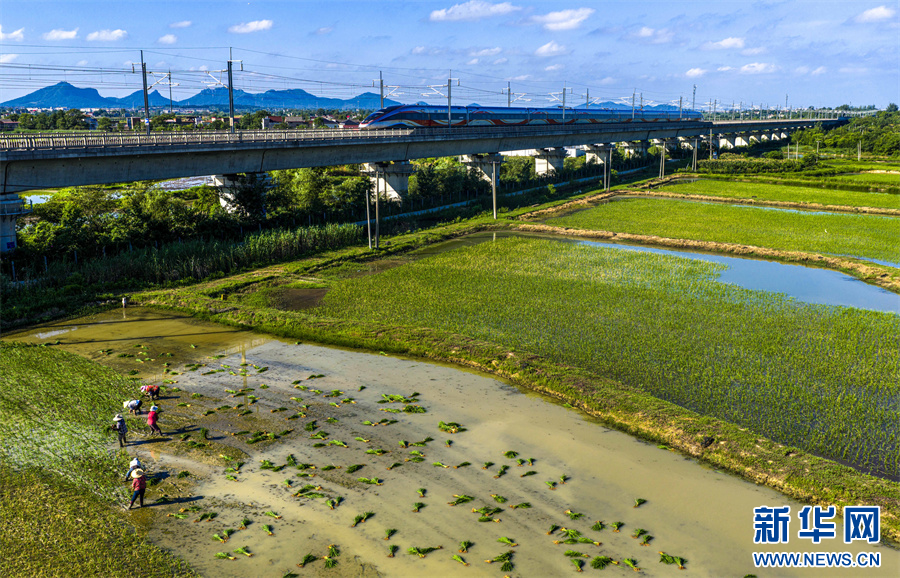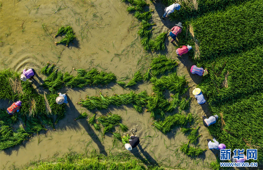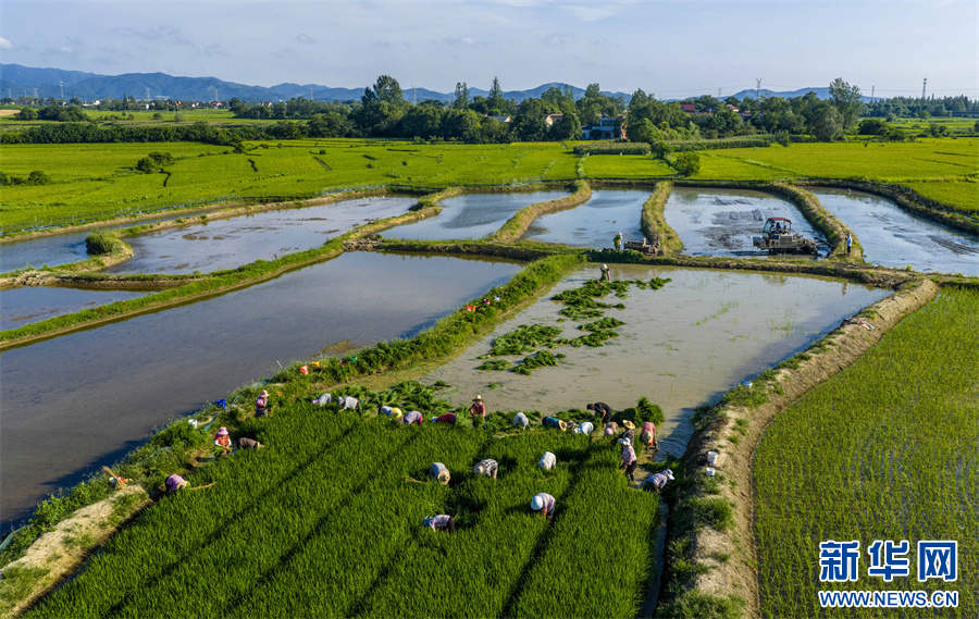 7月8日,安徽省合肥市庐江县柯坦镇枣岗村,农民在虾田里栽种水稻。