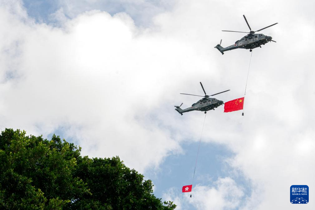 7月1日,香港特区政府在金紫荆广场举行升旗仪式,庆祝香港回归祖国28周年。这是分别悬挂中华人民共和国国旗、香港特区区旗的直升机从空中飞过。