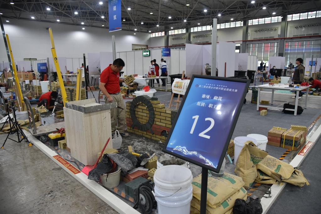 第二届全国乡村振兴职业技能大赛砌筑项目职工组比赛现场。新华社记者 李凡 摄