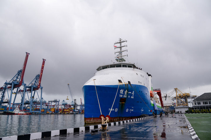 这是2024年3月22日在印度尼西亚雅加达拍摄的停靠在丹戎不碌港的“探索一号”科考船。中国科学院深海科学与工程研究所与印度尼西亚国家研究创新署2024年3月23日顺利完成为期一个月的爪哇海沟联合科考。新华社记者 徐钦 摄