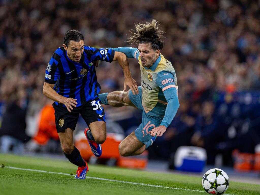 2024年9月19日,曼城队球员格拉利什(右)与国际米兰队球员达米安在欧冠联赛阶段第一轮比赛拼抢。新华社发