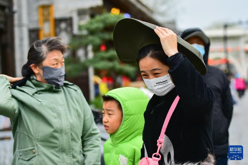 4月13日,在山东省青州古城景区,游客身穿厚衣在风中出行。