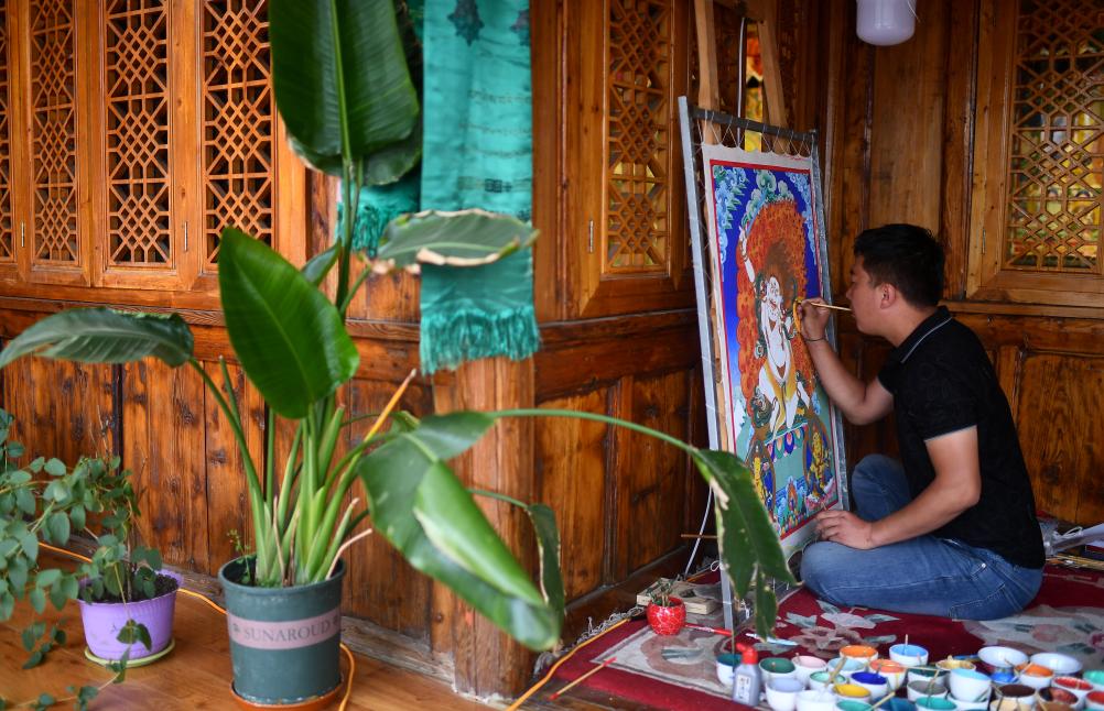 唐卡画师桑杰卡在同仁市郭麻日村的家中绘制唐卡。新华社记者 张宏祥 摄