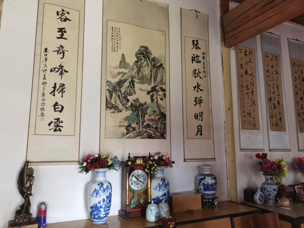 61岁土族退休教师田华的家,已有百年历史。这所老宅完整保留了青海河湟地区农村庄廓院的传统:四合院内四面靠墙建房,庭院中花木繁茂;正房内墙上挂有古训字画,条几上置古瓶、镜架和铜制供器,古色古香,颇有耕读传家遗风。