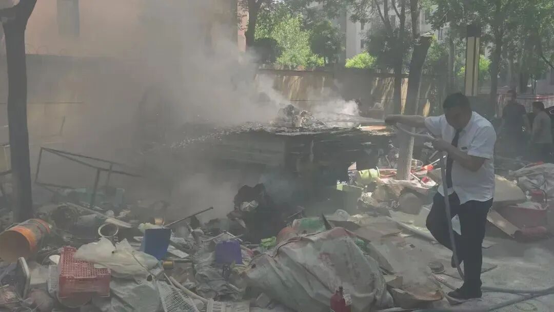 随着一声大喊,社区巡逻的微型消防站人员奔向着火的货车,使用灭火器先行处置,火第一时间被成功扑灭。