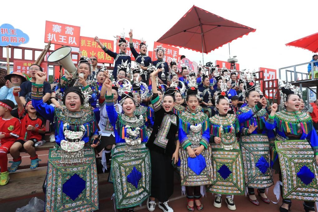 2024年5月4日,在贵州省黔东南苗族侗族自治州榕江县“村超”球场,当地群众身着盛装为本村球队加油鼓劲。新华社发(杨成利 摄)