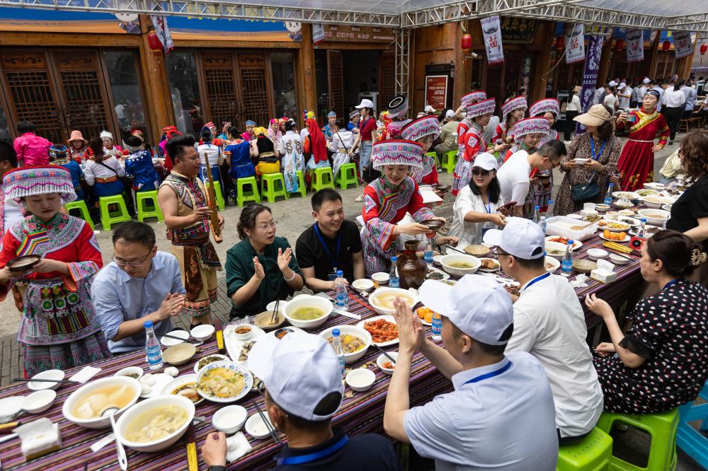 2023年4月20日,在四川省兴文县市民广场举行的四川省级非遗“兴文苗族花山节”展示传承活动上,嘉宾和游客体验苗家长桌美食宴。新华社记者 江宏景 摄