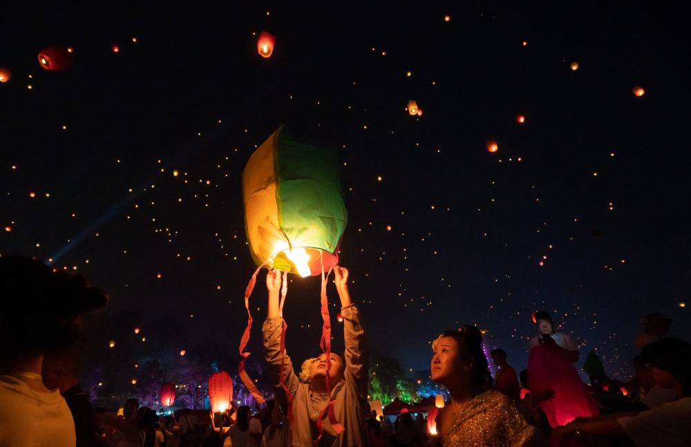 2023年4月13日晚,游客在云南省景洪市澜沧江边放飞孔明灯祈福许愿,庆祝傣历新年。新华社记者 江文耀 摄