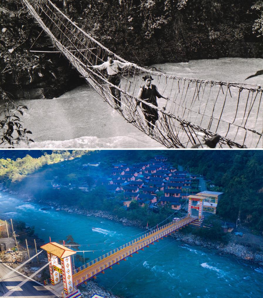 拼版照片:上图为独龙族群众通过藤蔑桥(资料照片);下图为独龙江乡白来感恩大桥(2020年10月29日摄,无人机照片,新华社记者胡超摄)。独龙族是我国28个人口较少的民族之一,也是新中国成立初期从原始社会直接过渡到社会主义社会的少数民族,主要聚居在云南贡山独龙族怒族自治县独龙江乡。近年来,国家有关部门和云南省以整体推进的思路对独龙江乡进行集中帮扶,加速消除基础设施、产业发展、人才素质等“瓶颈”问题,使当地经济社会实现跨越式发展。2018年,独龙族整族脱贫,实现“千年跨越”。