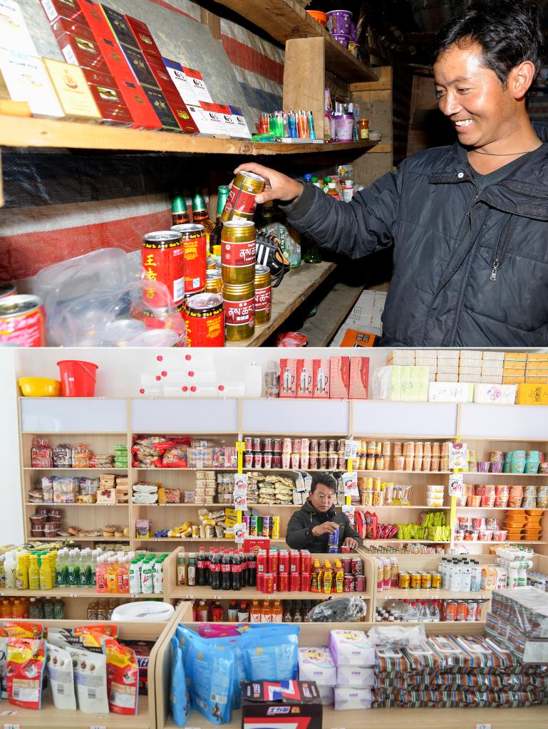 拼版照片:上图为玉麦乡一家商店的店主次旦扎西在摆放商品(新华社记者普布扎西摄,2009年9月9日摄);下图为玉麦乡一家超市的工作人员白玛旺堆在店内整理商品(新华社记者丁汀摄,2024年10月15日摄)。西藏自治区山南市隆子县玉麦乡地处喜马拉雅山脉南麓。受恶劣自然条件影响,这里一度只有桑杰曲巴和女儿卓嘎、央宗三人居住,牢牢守在祖国边境线上,这里也曾被称为“三人乡”。如今,曾经的“三人乡”已经发展到67户200多人,变成下辖两个行政村的“小康乡”。学校、卫生院、游客接待中心等建筑物在这里拔地而起,不少村民用自家房屋开起了家庭旅馆、小卖部、快递站等……2023年,玉麦全乡人均年收入超4万元,人均居住面积达40平方米。如今的玉麦,迎来了“蝶变”。