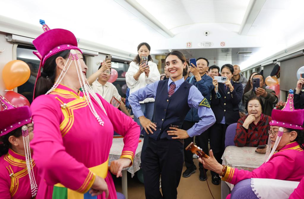 在由喀什开往成都西的列车上,塔吉克族列车长艾尔开牙·多力开与民间艺人一起跳舞(2024年4月19日摄)。回忆入职经历,艾尔开牙·多力开说:“这是一次幸福的机遇。”2019年,为助力脱贫攻坚,铁路部门在新疆喀什、和田等地招录1000多名应届毕业生。刚走出大学校门的艾尔开牙·多力开抱着试一试的心态,带着对远方的憧憬,与铁路结缘。在担任列车员的四年时间里,艾尔开牙·多力开一步步成长,工作出勤、作业规范等考核都名列前茅。2023年下半年,她以优异成绩通过系列综合测评,成为我国首位塔吉克族列车长。新华社记者 胡虎虎 摄