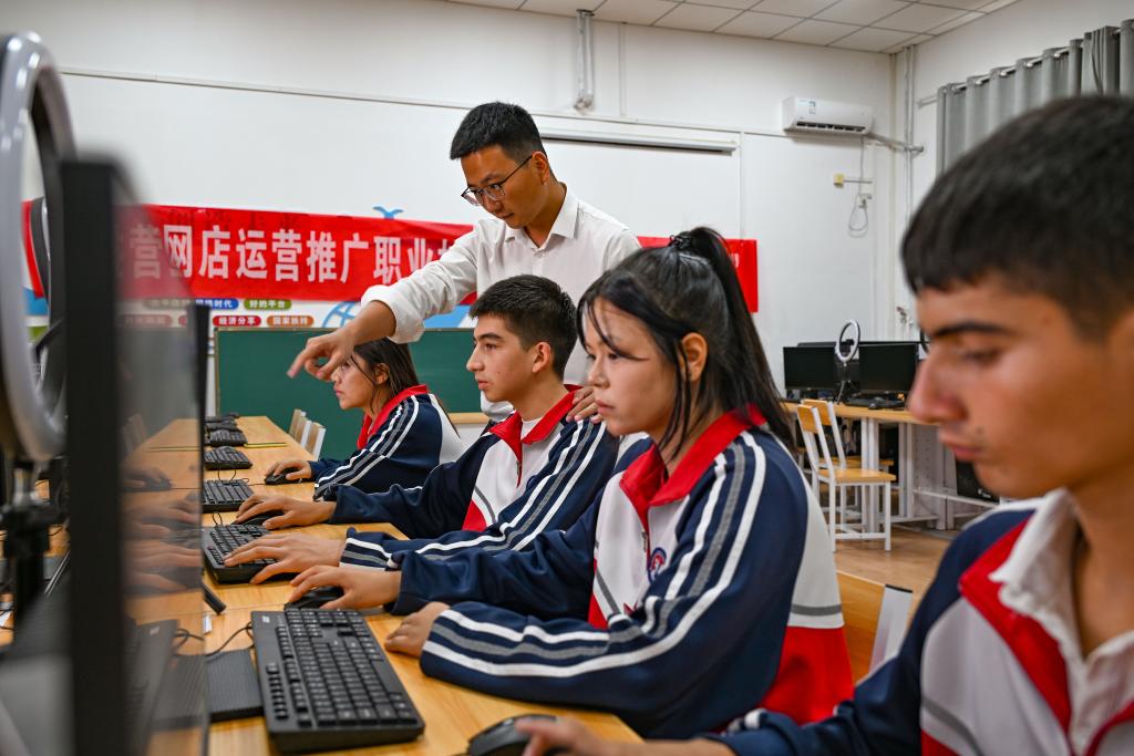 2024年9月10日,在阿拉尔职业技术学校,李斌傲在实训室指导学生。“95后”年轻教师李斌傲是第十一批浙江台州到新疆阿拉尔职业技术学校援疆教师中的一员。2023年2月,李斌傲前往阿拉尔任教。一年半任期结束后,他没有选择回到台州,而是申请留下来,在阿拉尔继续播撒知识的种子。新华社记者 陈朔 摄