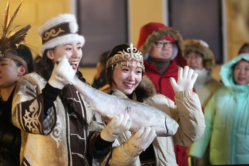 2024年1月6日,戴着鱼皮头饰的赫哲族姑娘(右)与黑龙江省饶河县文旅推荐官在哈尔滨中央大街上推介家乡特产鱼品,让天南海北的游客感受到浓郁的赫哲民族风情。新华社记者 王建威 摄