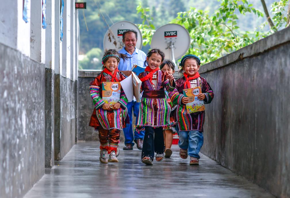 贵州省黔东南苗族侗族自治州从江县西山镇的中寨教学点,教师孟荣达(后)与学生们在下课后走出教室(2024年9月6日摄)。新华社记者 杨文斌 摄