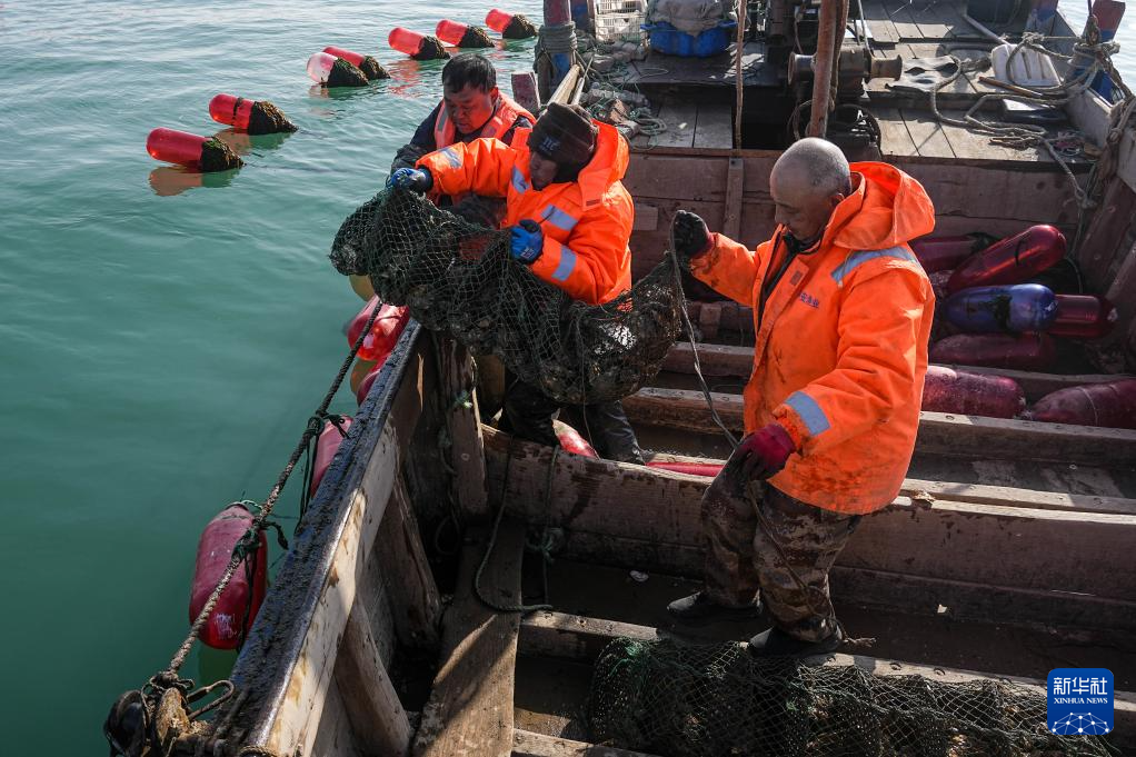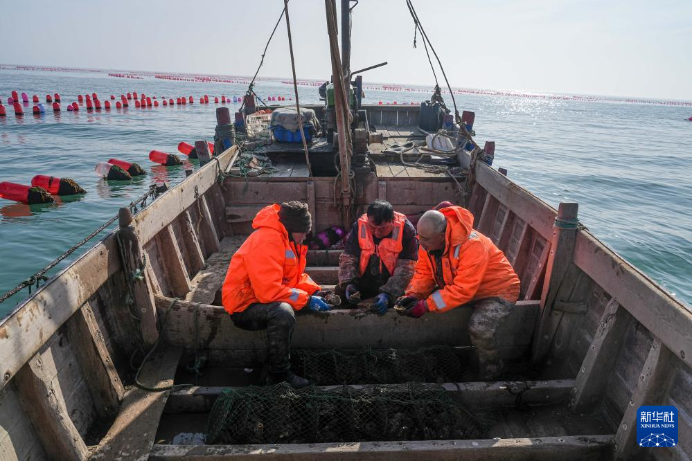 3月12日,养殖工人在长岛海域养殖区查看牡蛎生长情况。新华社记者 朱峥 摄