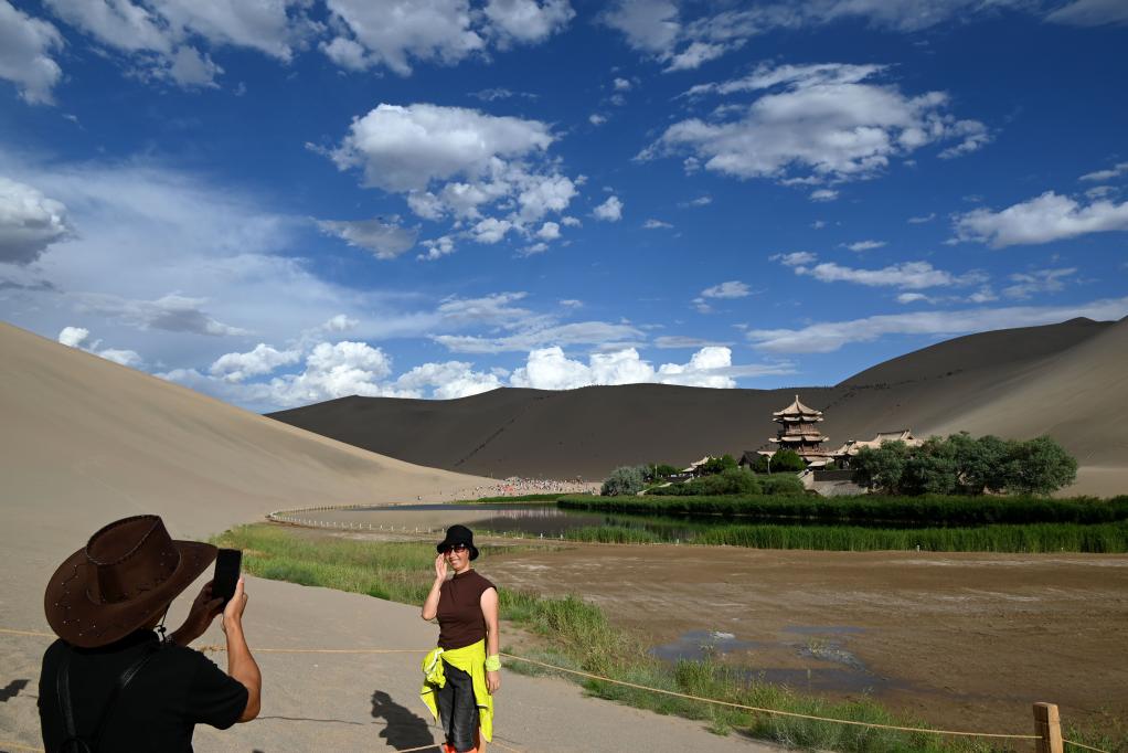 游客在甘肃省敦煌市鸣沙山月牙泉景区游览拍照(6月21日摄)。新华社发(张晓亮摄)