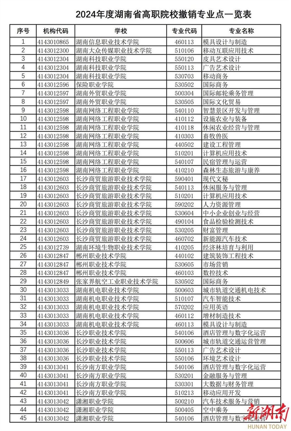湖南日报4月9日讯(全媒体记者 余蓉 刘镇东 黄京)教育部近日公布2024年度高等职业教育专科专业设置备案结果,2024年拟招生专业点共66870个。与2023年度相比,新增专业点6068个,撤销专业点5052个。此次调整优化幅度是自2021年新版《职业教育专业目录》发布以来最大的一年。其中,湖南高职新增专业点182个,撤销专业点70个。