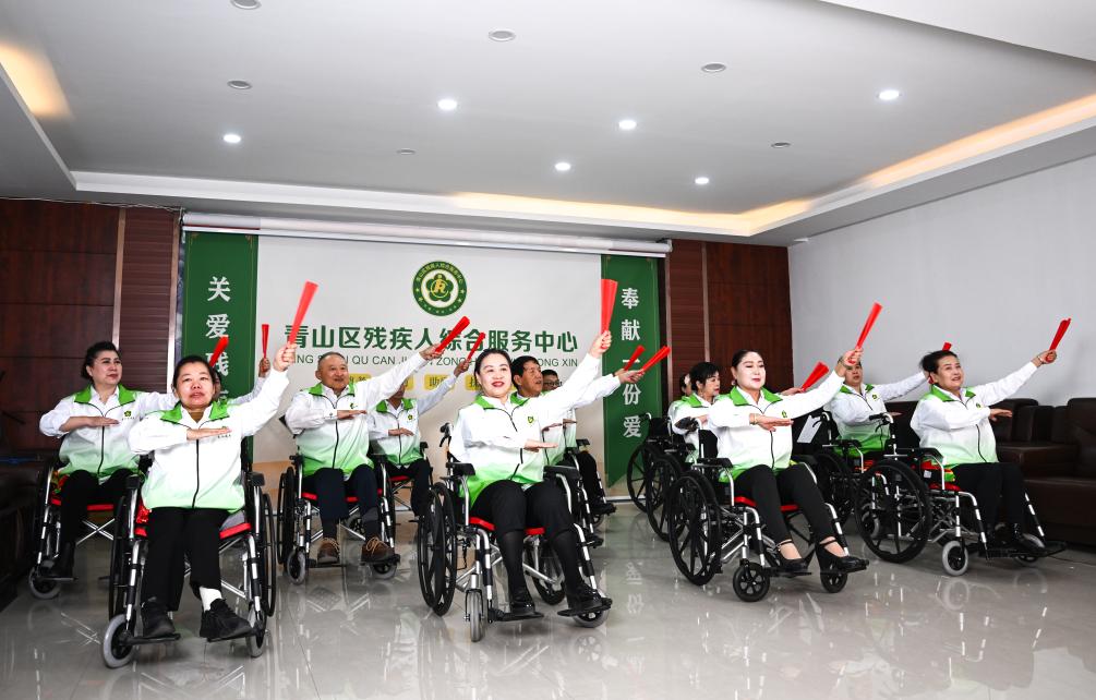 4月15日,残障人士在内蒙古包头市青山区残疾人综合服务中心排练扇子舞。新华社记者贝赫 摄