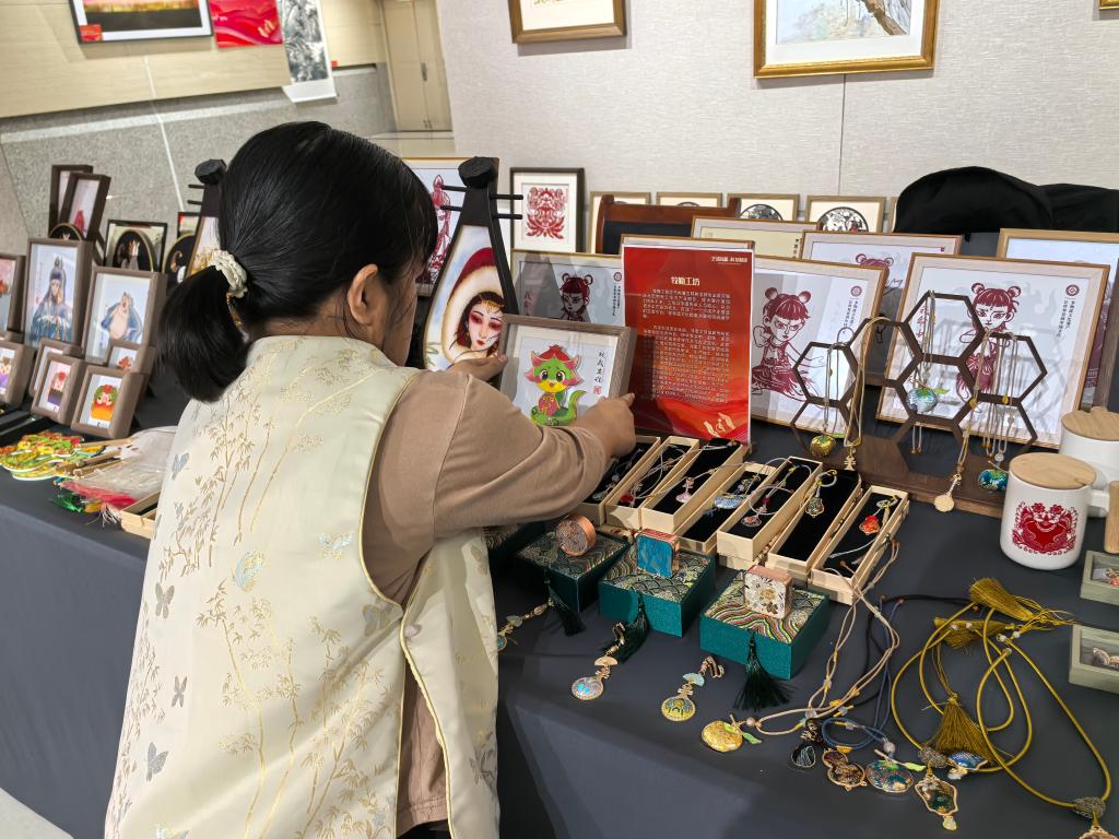 4月17日,在呼和浩特市牧勒工坊就业的姚静在呼和浩特市文化馆整理摊位上的非遗文创产品。新华社记者魏冠宇 摄