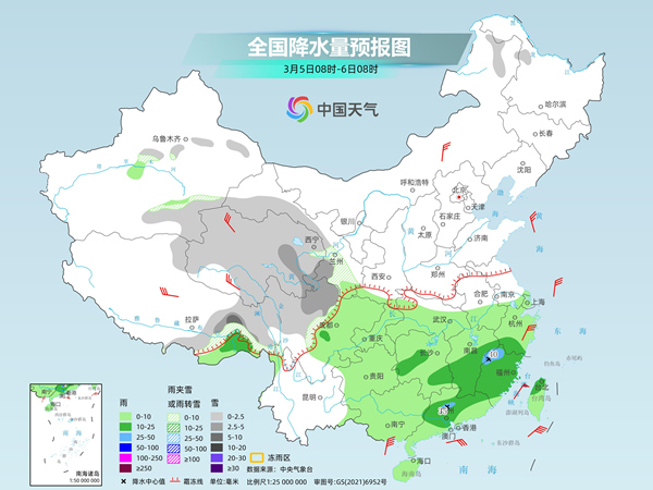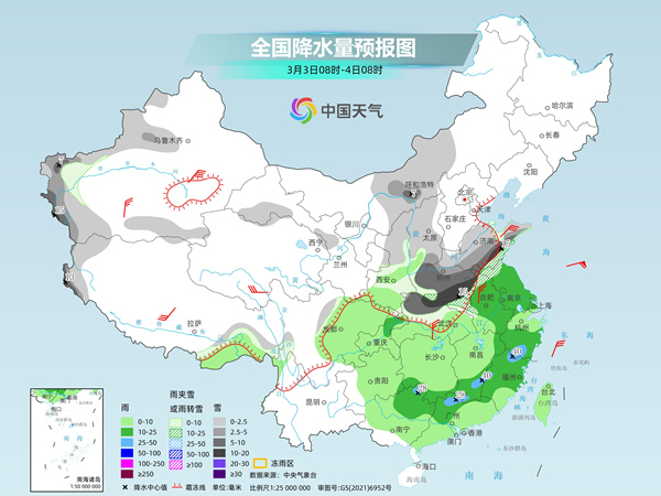 今天(3月3日),我国中东部大范围雨雪持续,部分地区有大到暴雪,明后天,我国降水总体有所减弱,但降水范围仍然较大,需注意防范雨雪天气对交通出行等方面的不利影响。在寒潮和降水影响下,今天江南等地将现“跨季式”降温,多地气温降幅可达20℃左右,体感由初夏回到冬天,公众请注意添衣保暖。