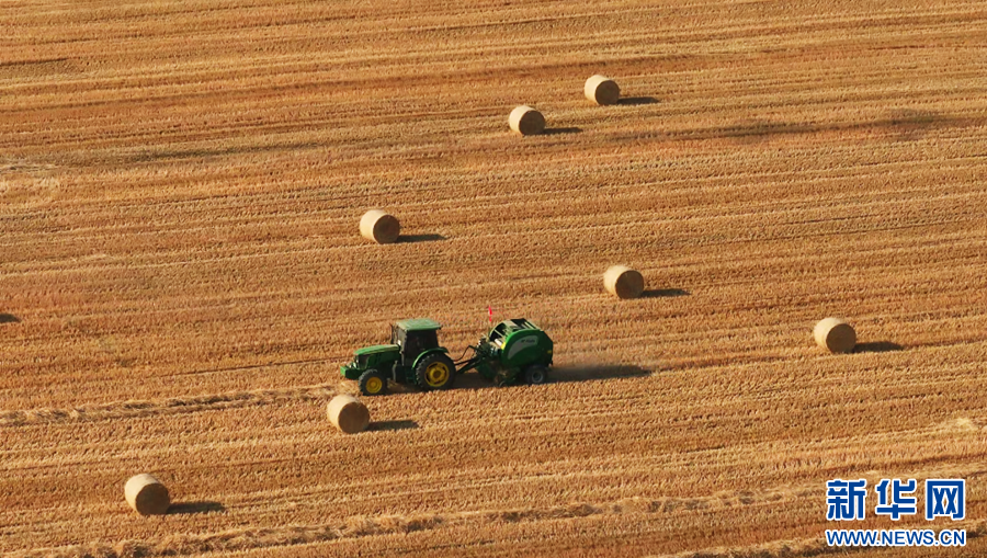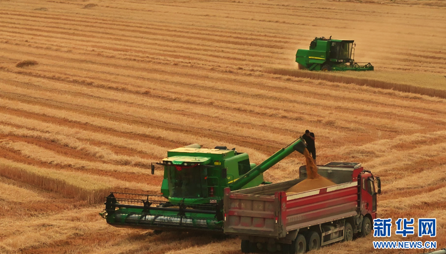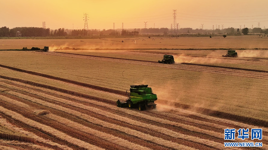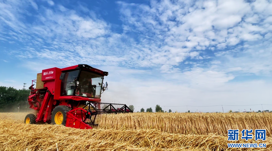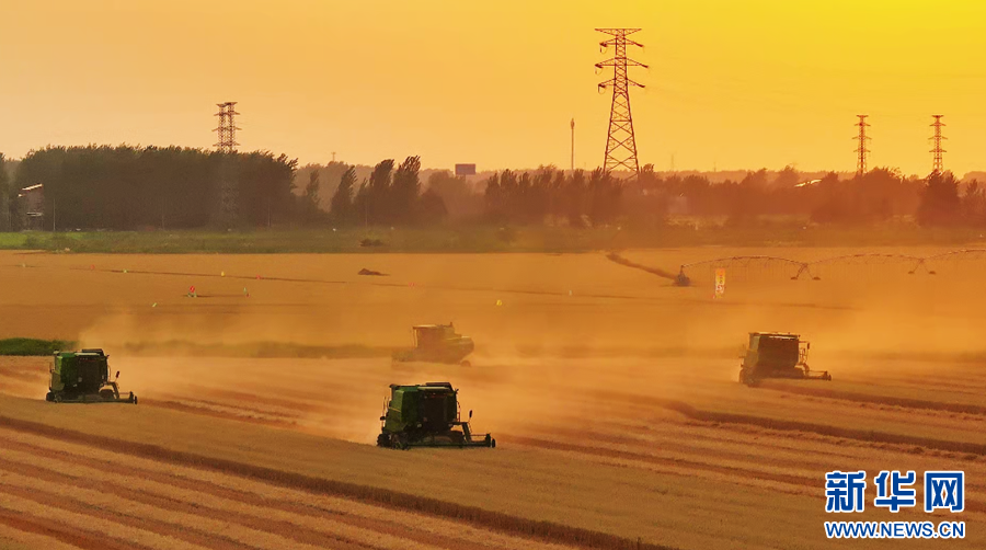 又到一年麦收季。近日,在全国粮食生产大县安徽省太和县,收割机正在有序作业,麦粒从收割机中“喷涌”而出,呈现出一派丰收的景象。