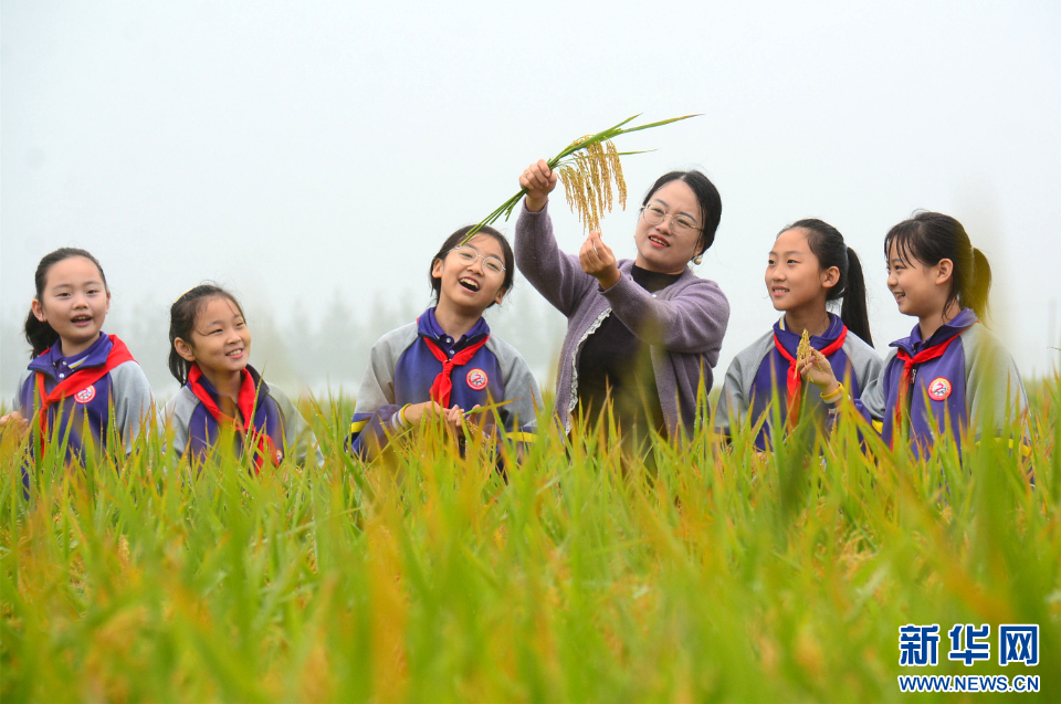 学生们在稻田里学习农业知识。新华网发(李学飞 摄)