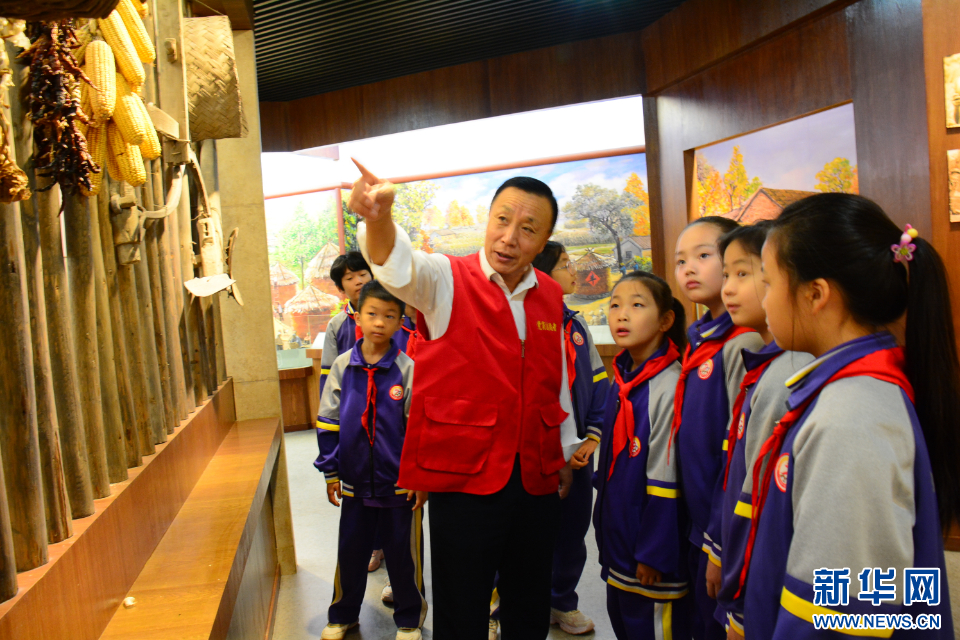 学生们在“乡村记忆馆”聆听社区志愿者讲解农耕史。新华网发(李学飞 摄)