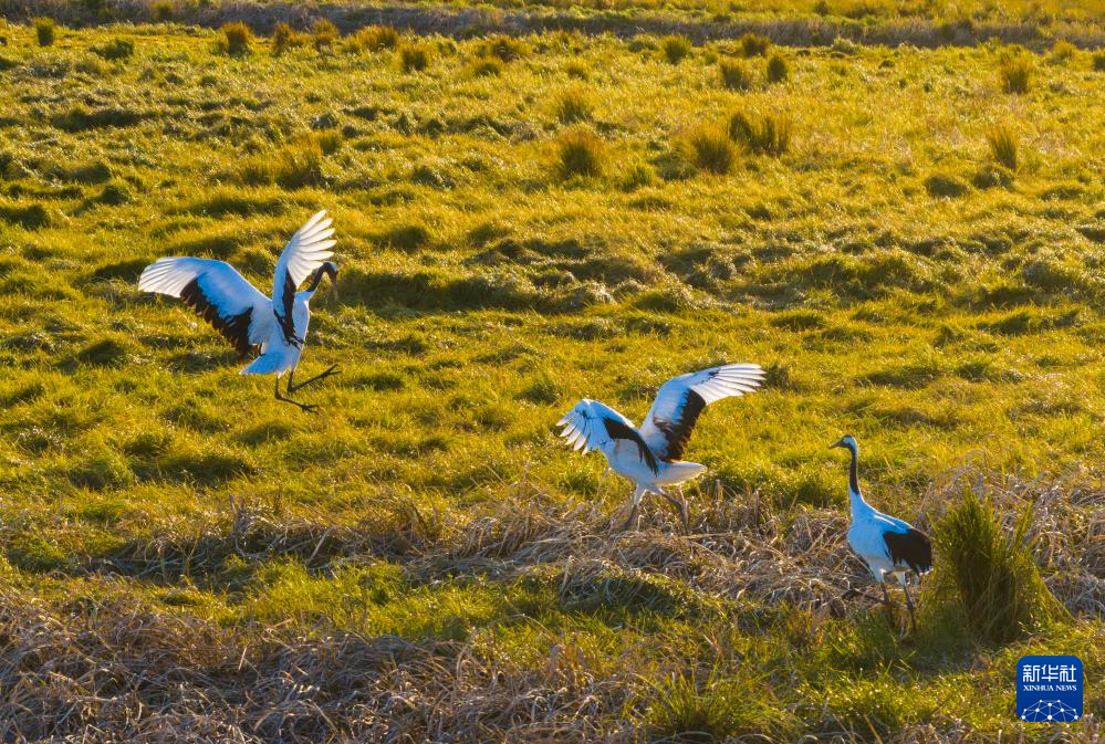 10月9日,在黑龙江挠力河国家级自然保护区,丹顶鹤在湿地中活动(无人机照片)。新华社发(韩阳摄)