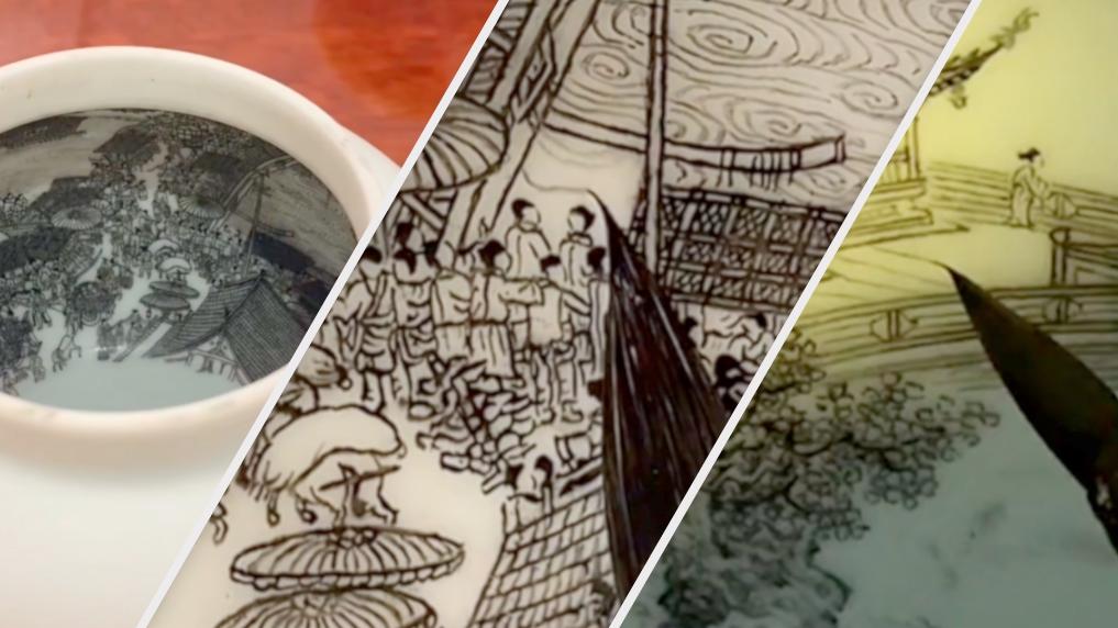 景德镇陶瓷内壁作画,融合传统技艺与现代创新的独特工艺。匠人需左手持瓶、右手执特制竹笔,在封闭空间内反向作画,山水花鸟需一气呵成。