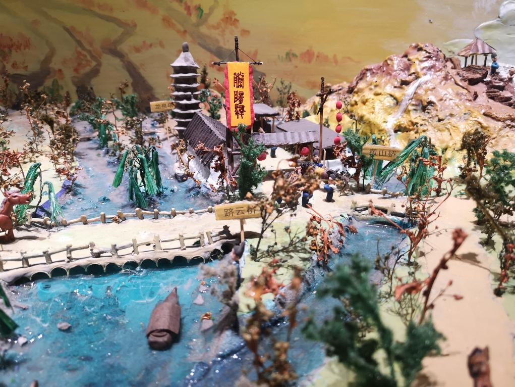 “‘翻新’传统面塑,最重要的是让它保留乡愁记忆和传统文化的内核。”梁军一直在研究传统艺术作品,从中汲取创作灵感。他的面塑作品《明清时期南北大官道实景图》,借鉴《南巡纪道图》《清明上河图》设计制作城市风光、街市店铺、桥梁河道、车马船只、人物形象等,借鉴《千里江山图》的青绿山水设色,把四季景象融入到整个画面。同时,他采用了传统国画的散点式构图和平面、立体相结合的表达方法,一步一景,层次丰富,生动地描绘了明清南北大官道的繁荣景象。