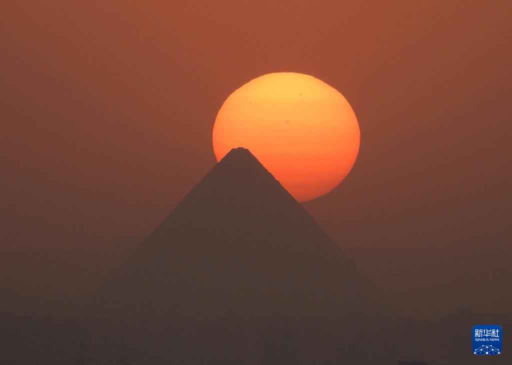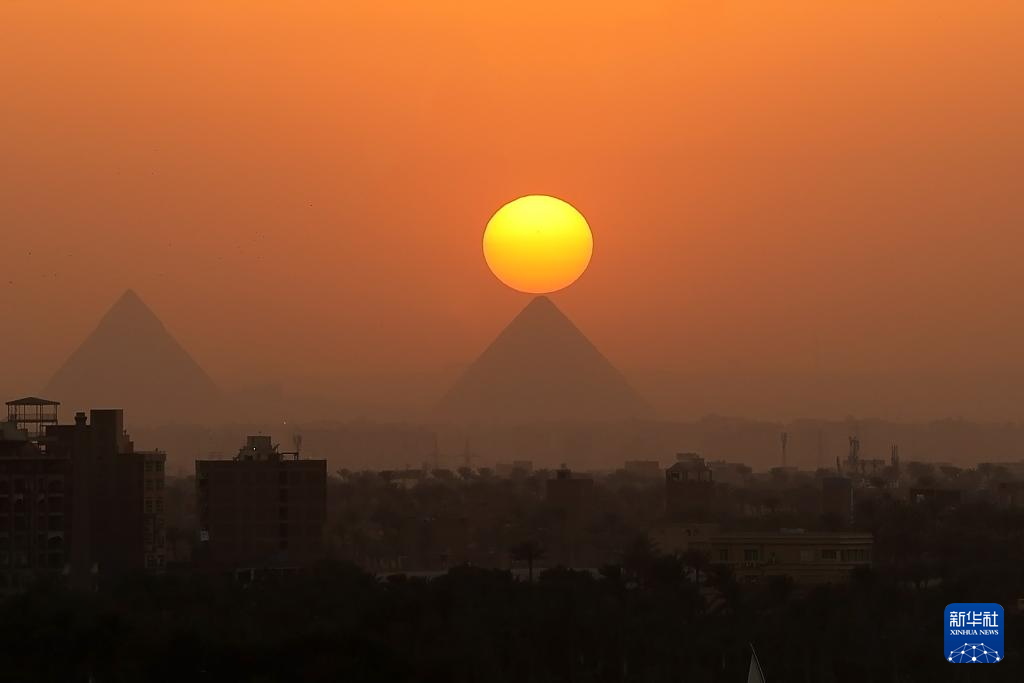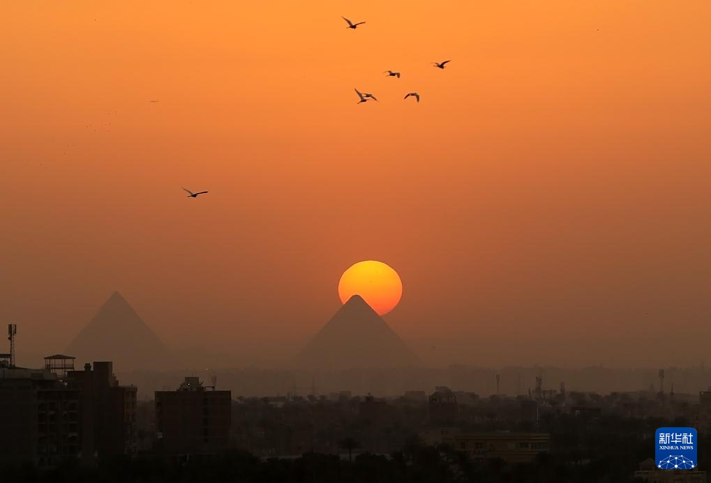 这是4月19日在埃及开罗拍摄的吉萨金字塔群日落景色。新华社记者 王东震 摄