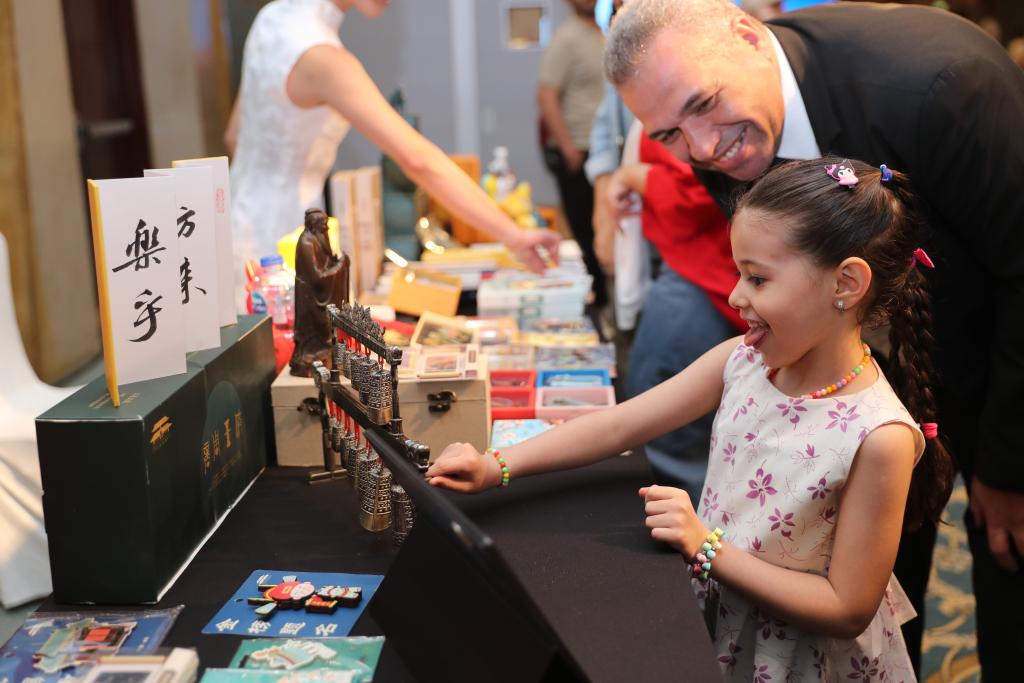 6月12日,一名女孩在埃及开罗举办的“茶和天下”尼罗雅集活动现场体验“遇见孔子”非遗文创产品。新华社记者 隋先凯 摄