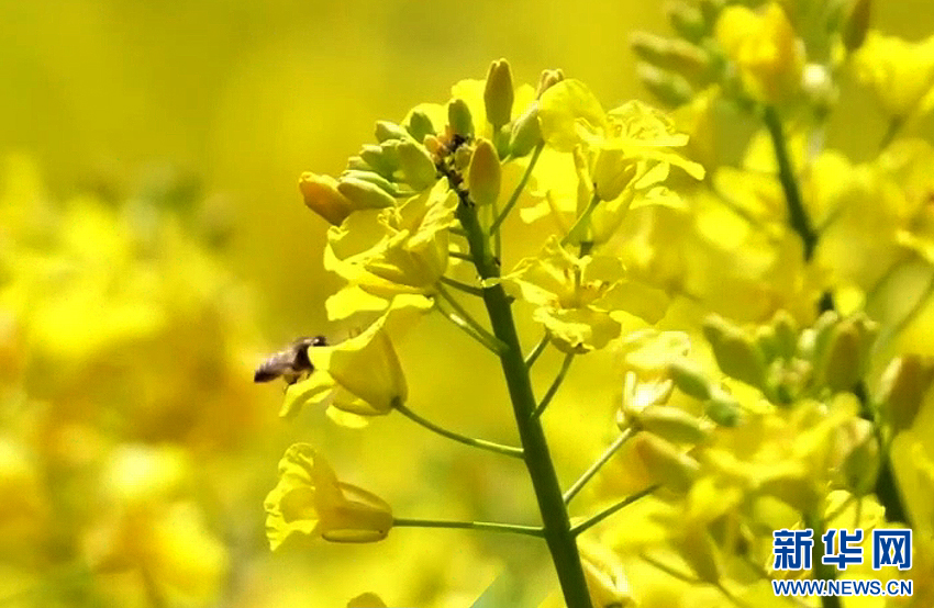 春日油菜花盛放,金黄花海吸引蜜蜂飞舞采蜜。新华网发(崔宏彬 摄)
