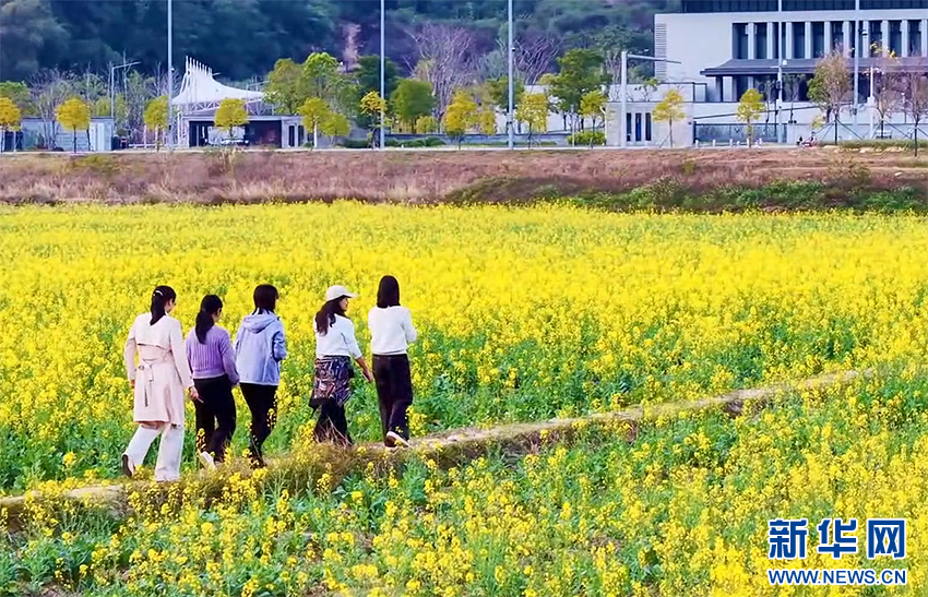 游客在广州国家版本馆前的油菜花海中漫步。新华网发(崔宏彬 摄)