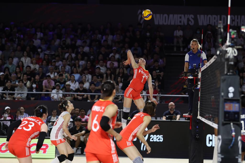 8月27日,中国队球员吴梦洁(上)在比赛中扣球。当日,在2025年世界女排锦标赛F组比赛中,中国队3:0战胜多米尼加队。新华社记者 孙玮彤 摄