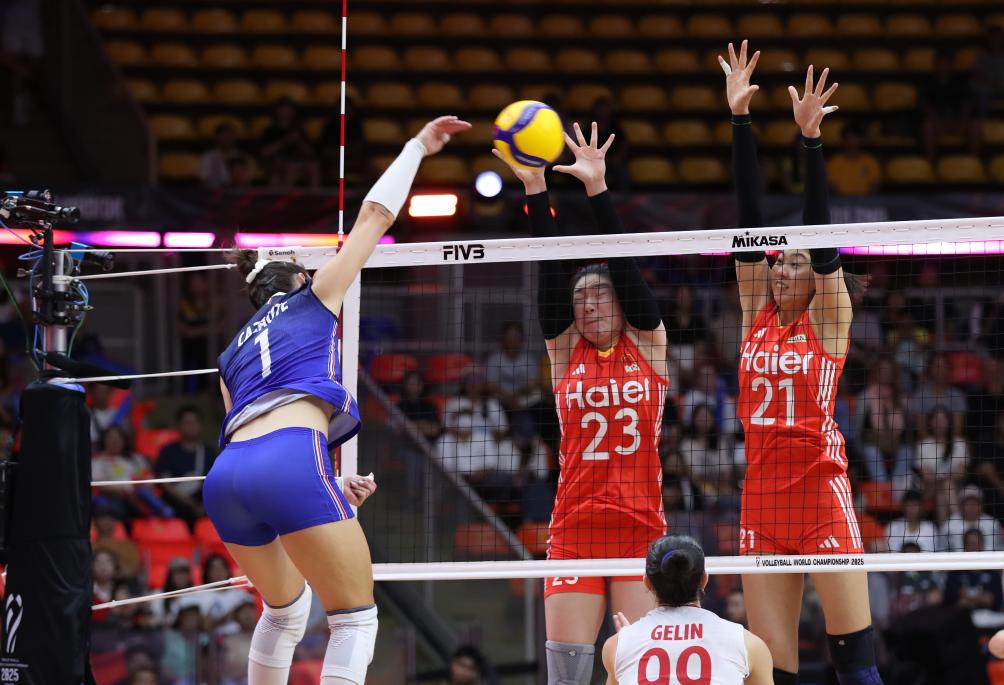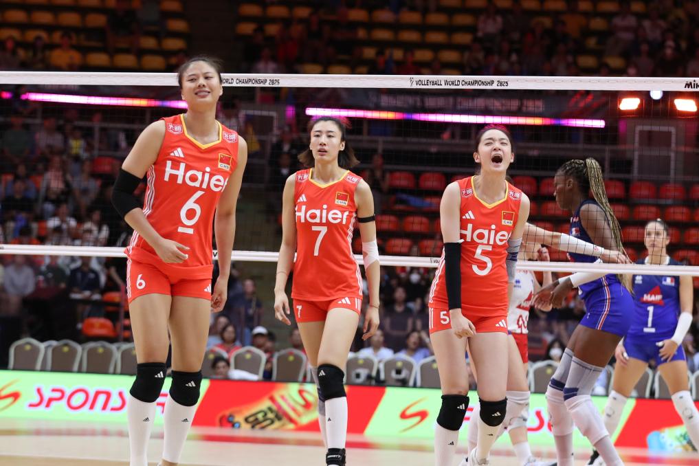 8月31日,中国队球员张籽萱(上中)、高意(上右)在比赛中拦网。当日,在2025年世界女排锦标赛八分之一决赛中,中国队1:3不敌法国队,无缘八强。新华社记者 孙玮彤 摄