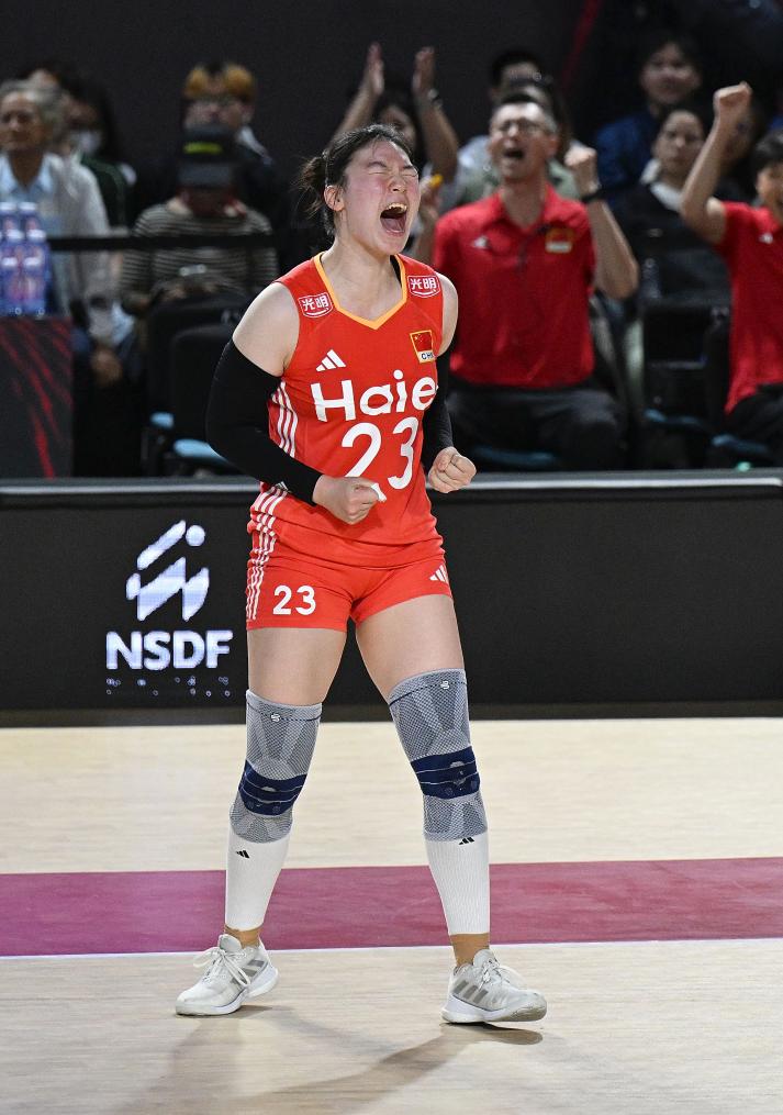 8月27日,中国队球员张籽萱在2025年世界女排锦标赛F组小组赛中庆祝得分。新华社记者 侯昭康 摄
