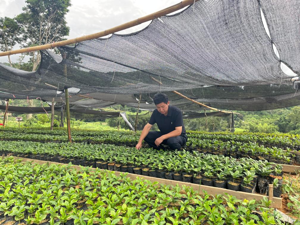 7月3日,张新云在苗圃查看咖啡苗长势。新华社记者 罗江 摄