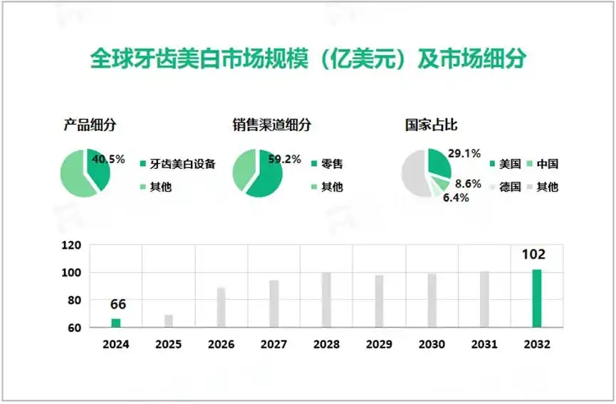 随着审美观念的升级与消费结构的变化,口腔美容逐渐成为消费热点,其中牙齿美白市场发展尤为迅猛。根据贝哲斯咨询调研数据显示:2024年全球牙齿美白市场规模达66亿美元,预计到2032年将增至102亿美元。