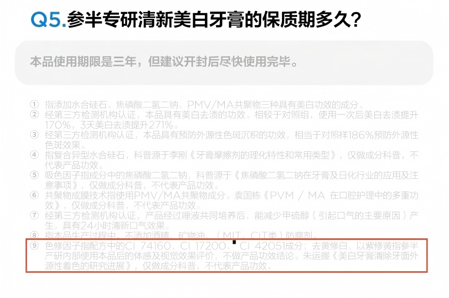 一款参半专研清新美白牙膏在其产品页面中声称其产品含有“色修因子”和“吸色因子”,可以吸色、锁白。而在页面的下端,几行颜色灰白几乎看不清楚的小字标注,色修因子是指其成分表中的三种着色剂(CL74160、CL17200、CL42051)。
