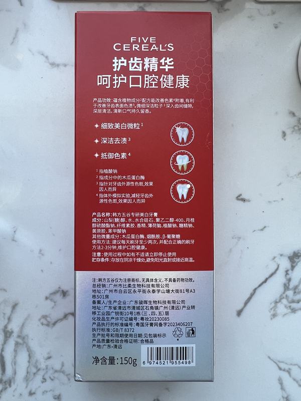 “三天白九度,医美级牙膏”——在韩方五谷专研美白牙膏的电商页面中,这句广告语被置于醒目位置,并配有牙齿从暗黄到洁白的动态对比图。然而,记者发现该产品外包装标注的执行标准为普通牙膏的GB/T 8372,而未标注功效型牙膏执行标准QB/T 2966。