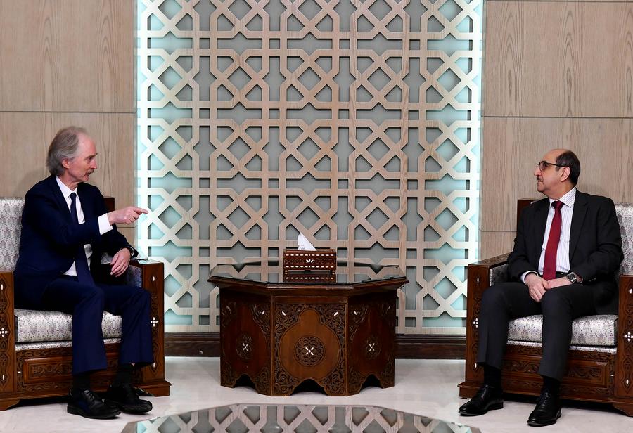 11月24日,在叙利亚大马士革,联合国秘书长叙利亚问题特使裴凯儒(左)与叙利亚外交和侨民事务部长萨巴格会晤。新华社发(阿马尔·萨法尔贾拉尼摄)