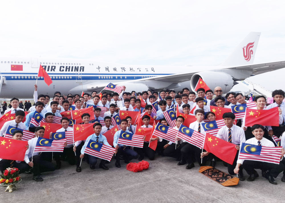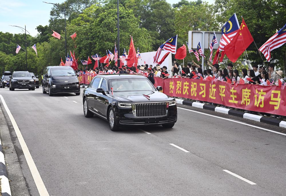 马来西亚青年载歌载舞,当地中资企业人员、留学生和华侨华人聚集在道路两旁挥舞中马两国国旗,热烈祝贺习近平访问马来西亚取得圆满成功。