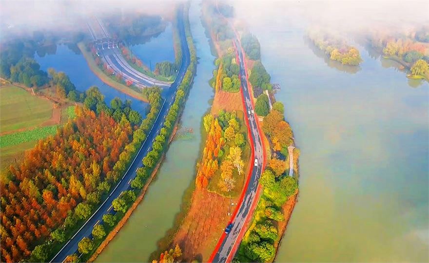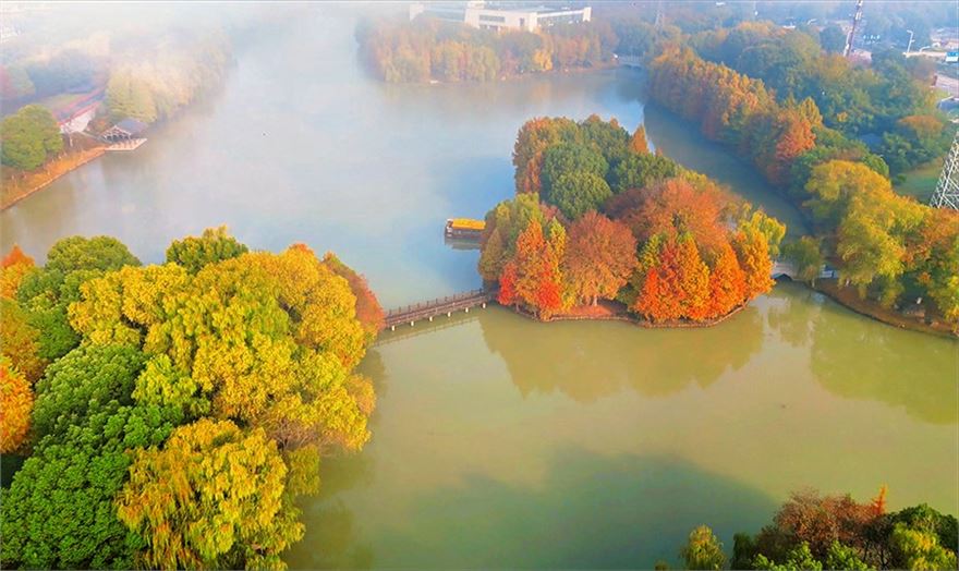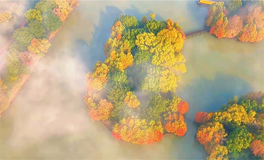 近日,安徽省颍上县五里湖生态湿地公园薄雾笼罩,湖水、红杉林、小桥若隐若现,宛如一幅流动的水墨画。新华网发(徐庆 摄)