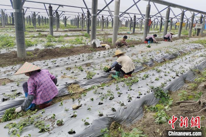 3月28日,水心村村民在农光互补项目基地种植广金钱草。 黄天文 摄
