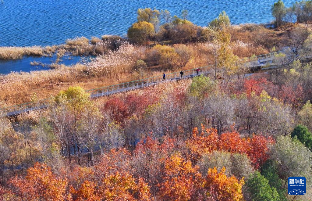 10月20日,市民在哈尔滨市松北区的湿地中欣赏秋色(无人机照片)。新华社发(杨威摄)