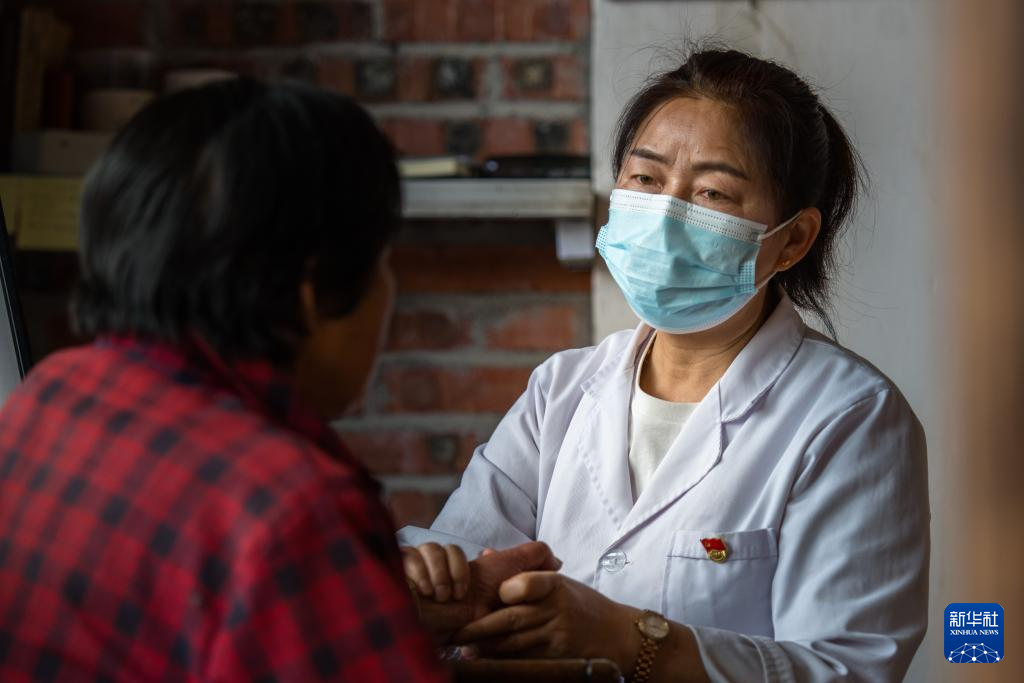4月17日,黄爱玲在中和镇大村社区卫生所为病人号脉。新华社发(彭奕凯摄)